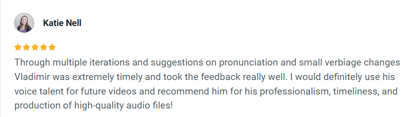 “Vladimir was amazing!! Not only did his voice perfectly fit our project, he provided more than we could have asked for and took direction very well from our script. Would definitely work with him again!”